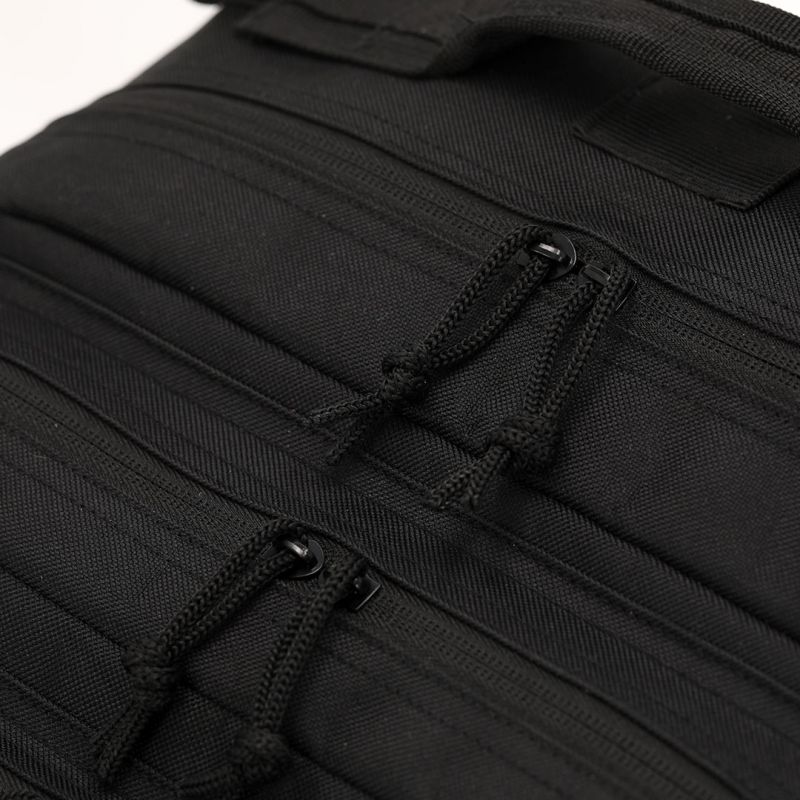 Mochila táctica en resistente poliéster RPET 600D. Parte frontal con múltiples bolsillos, además de soportes elásticos y velcros para colgar los accesorios necesarios durante la aventura. Compartimento principal con cierre de cremallera de doble tirador y bolsillos interiores con varios compartimentos, con capacidad para portátil de 17 pulgadas. Incluye esquinas reforzadas y asa de transporte. Con espalda y cintas de hombros acolchadas y ajustables, y correas frontales para mayor comodidad. Etiqueta con distintivo de RPET.