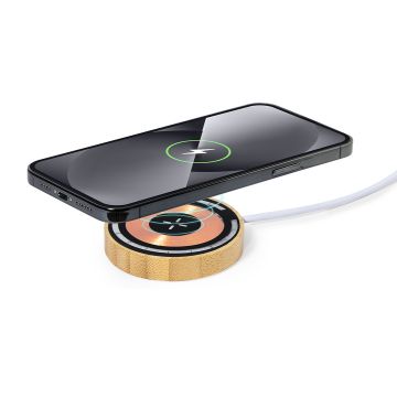 Cargador inalámbrico 15W, de original diseño con una superficie transparente que permite ver los componentes internos del dispositivo. Con base de bambú y fijación magnética Magsafe, compatible con dispositivos equipados con tecnología de carga inalámbrica Qi. Conexión Tipo C, con manual de instrucciones en español e inglés. Presentado en caja individual de diseño kraft.