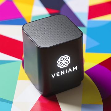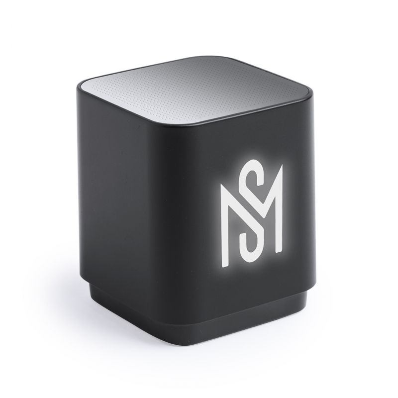 Altavoz con conexión Bluetooth®, luz led interior y cuerpo especialmente diseñado para marcaje en láser, iluminando así el logotipo. Con 3W de potencia y función manos libres. Recargable mediante cable USB -incluido- y presentado en una atractiva caja de diseño.