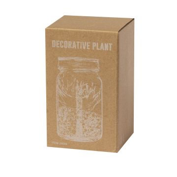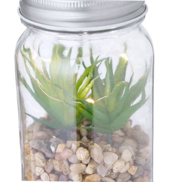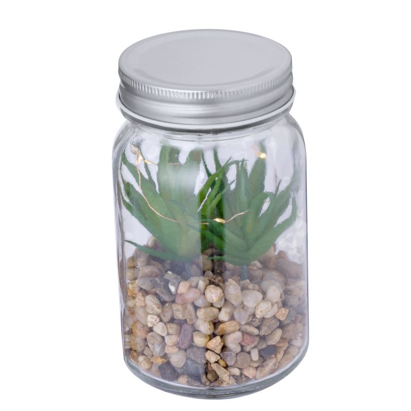Planta decorativa sobre una base de piedras, en tarro de cristal de borosilicato. Iluminada por 5 LEDs que funcionan con 3 pilas AAA (no incluidas). Presentado en caja de diseño kraft.