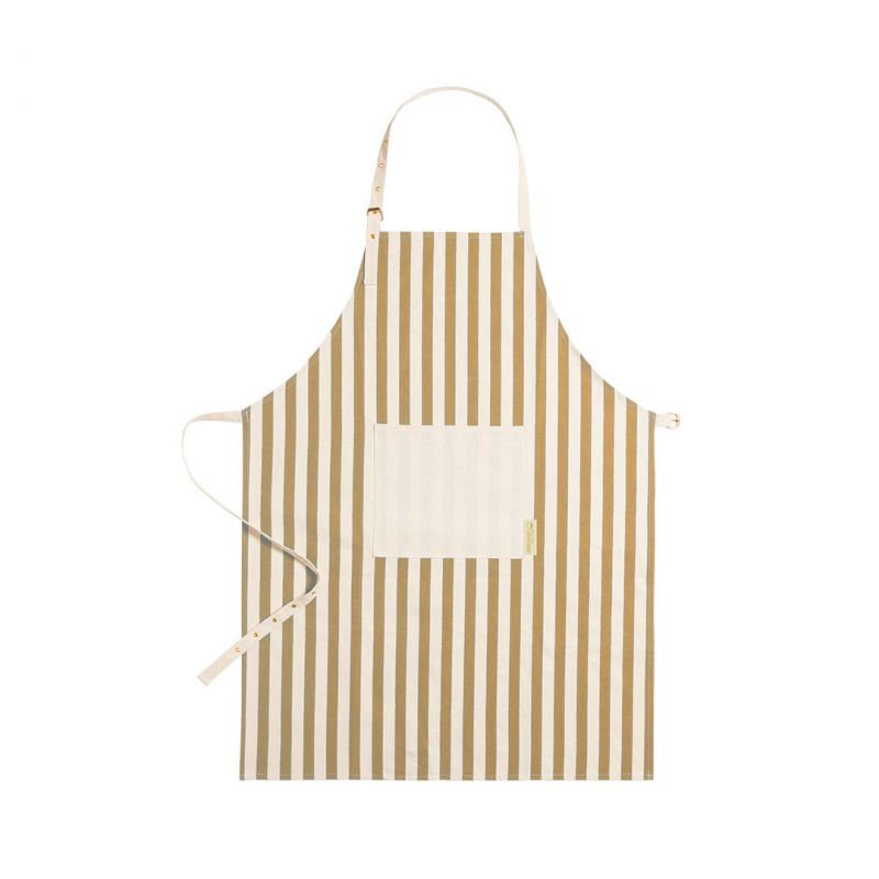 Delantal de línea nature fabricado principalmente en algodón orgánico, cultivado usando métodos sostenibles, sin insecticidas, fertilizante u otros productos químicos, favoreciendo así el cuidado del medio ambiente. De innovador diseño a rayas verticales, con bolsillo frontal en color natural y de corte por debajo de la rodilla. Ajustable, con cintas en cuello y cintura. Distintivo algodón orgánico en etiqueta.