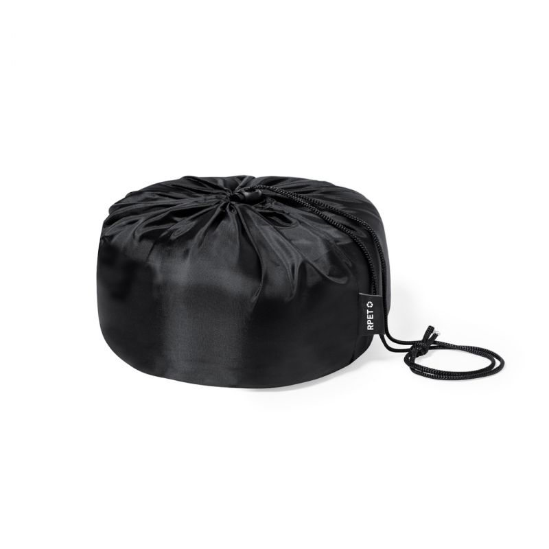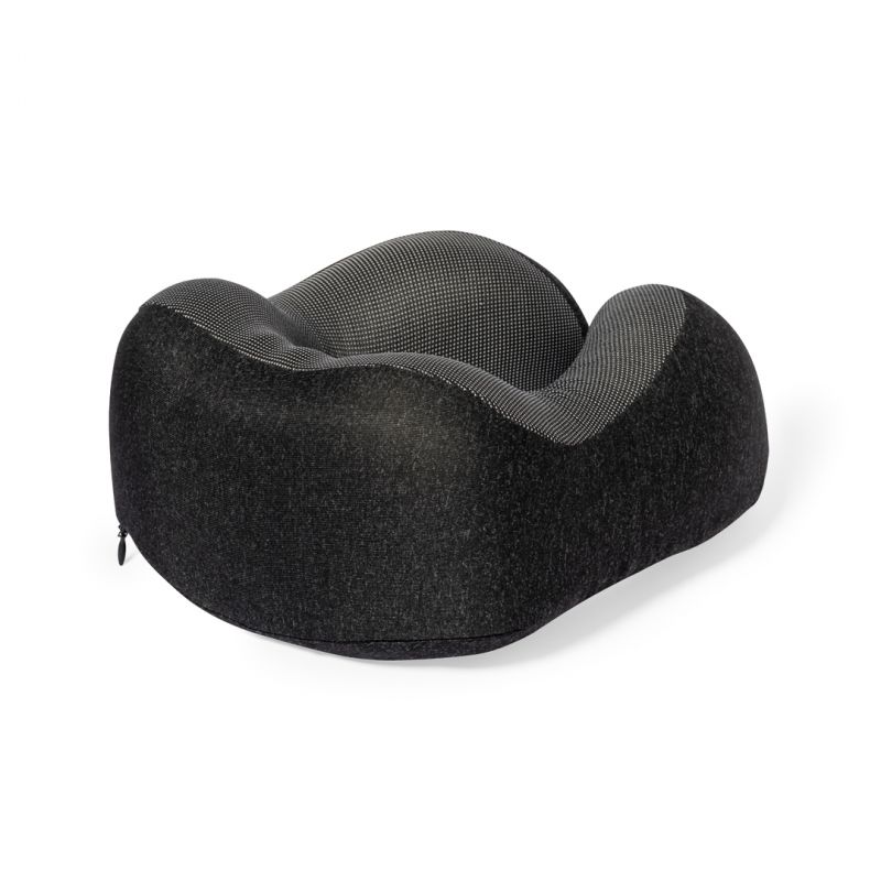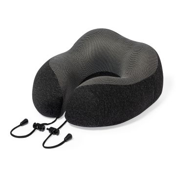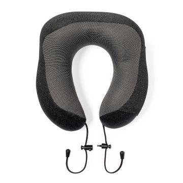 Cómoda almohadilla portátil acolchada para cuello. Máxima experiencia de confort para cualquier viaje gracias a la almohadilla de suave tacto y los cierres de cordón para un correcto y cómodo ajuste. Con funda confeccionada en RPET para protegerla en el transporte y etiqueta distintiva.