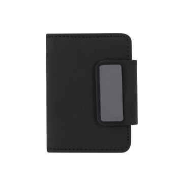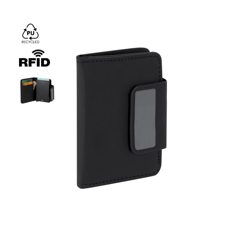 Tarjetero fabricado en PU reciclada. Capacidad hasta 10 tarjetas, con ingenioso mecanismo desliza y extrae de acceso a las tarjetas. Cierre magnético a través de solapa. Contiene 4 compartimentos. Tecnología de seguridad RFID (Identificación por Radio Frecuencia) que mantiene seguros tus dispositivos de transmisión de identidad. Distintivos RFID.