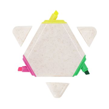 Original marcador fluorescente de tres colores fabricado en caña de trigo. Con cuerpo de triangulo en suave acabado brillante, especialmente diseñado para marcaje a todo color. Con capuchas opacas.