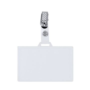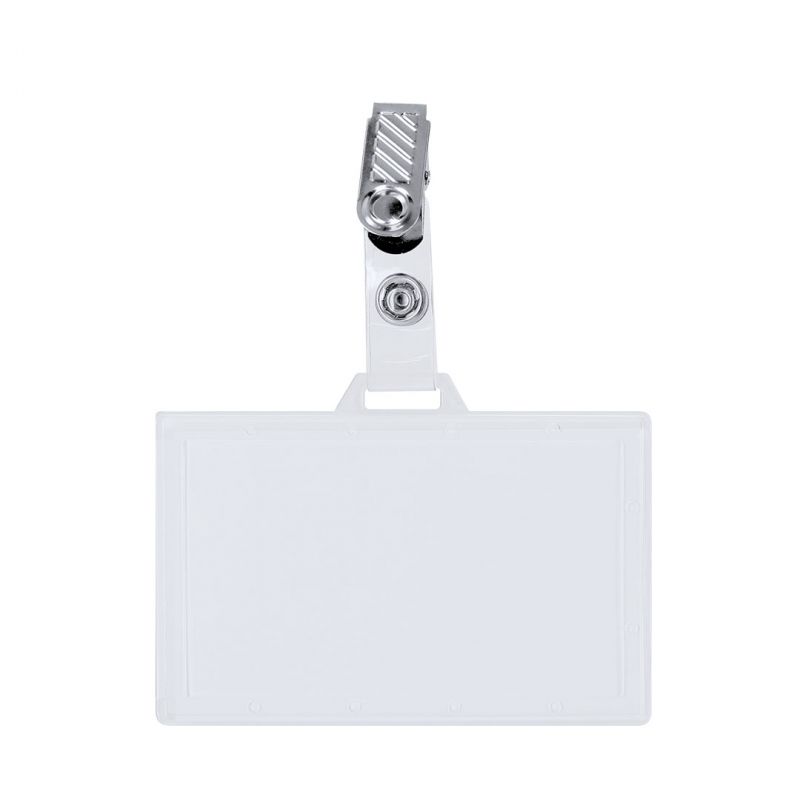 Identificador de PS rígido con pinza metálica en orientación horizontal. Ideal para llevar colgado y mostrar tu identificación. El sistema de cierre es extraíble y puedes utilizar el identificador en conjunto con lanyard.