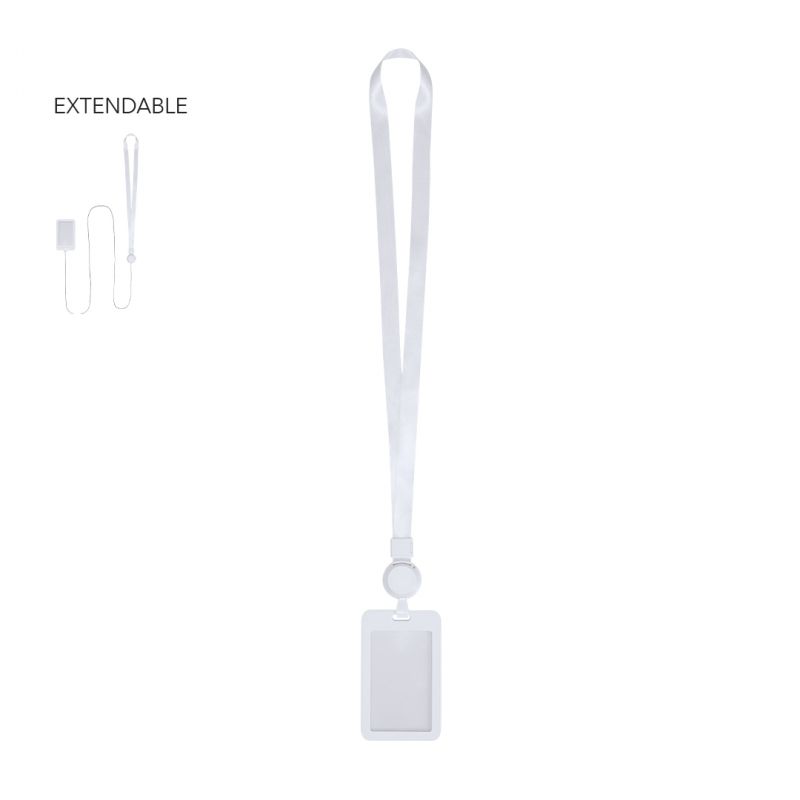 Identificador lanyard extensible. Portatarjetas en ABS desmontable con parte trasera opaca y parte frontal translúcida con enganche en clip. Cuerda extensible de hasta 70 cm y lanyard en poliéster blanco.
