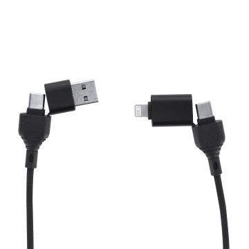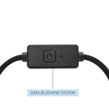Cable de carga de 60W y transferencia de datos, con sistema de protección de datos. Fabricado en aluminio reciclado en combinación con RPET y ABS reciclado. Incluye botón de seguridad integrado que permite desactivar la función de transferencia de datos, una solución práctica para proteger la información personal y confidencial cuando el cable se utiliza en espacios públicos, evitando accesos no autorizados o intentos de hackeo. Conexiones de entrada Tipo C y USB y de salida Tipo C y Lightling.