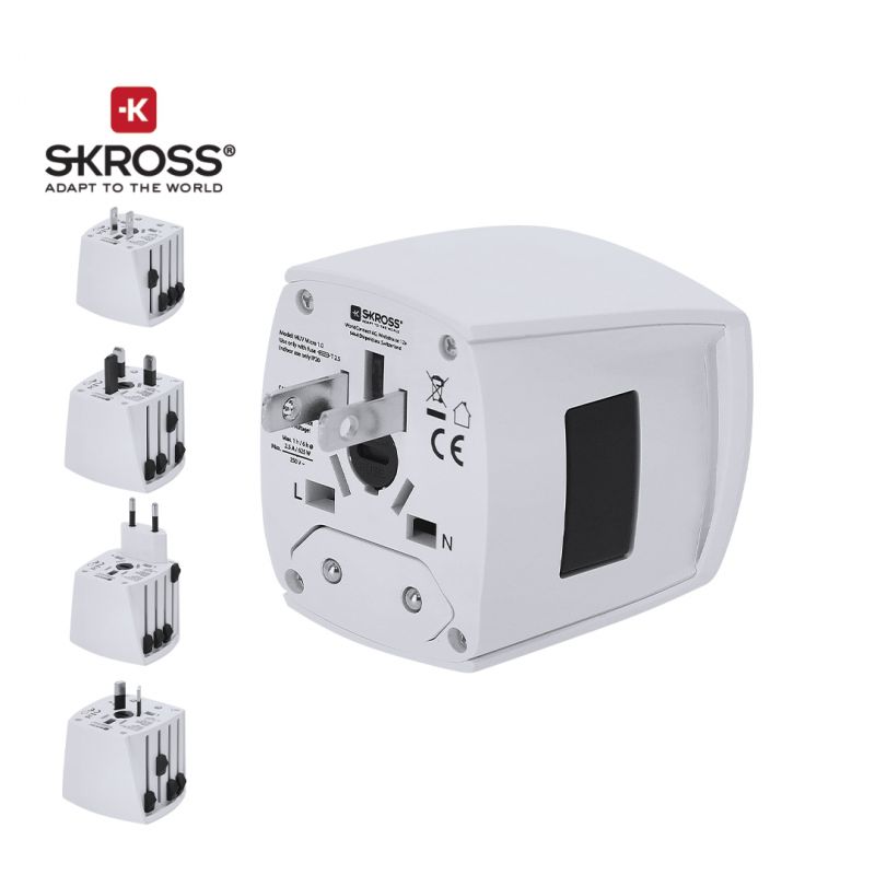 Completo adaptador de viaje universal marca SKROSS de diseño compacto y portable. Con múltiples salidas, especialmente indicado para viajes y con adaptadores multi región para Europa, USA, Japón, Australia y China.