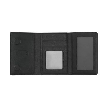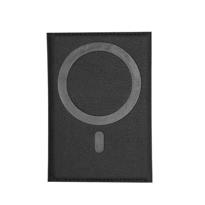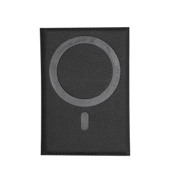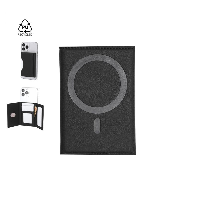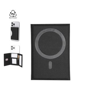 Tarjetero soporte en elegante PU reciclado. Con tarjetero multifuncional que ofrece 6 compartimentos, con cierre plegable magnético. Con sistema de fijación móvil magnético.