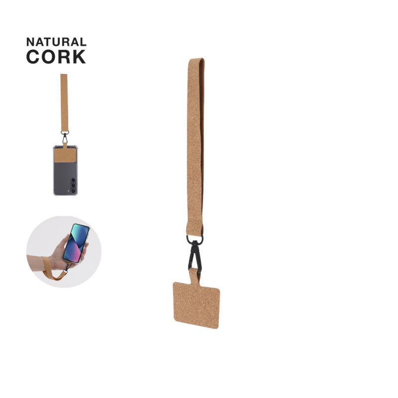 Pulsera soporte para smartphone fabricada en corcho. Con cinta de transporte a juego y mosquetón metálico giratorio en color negro.