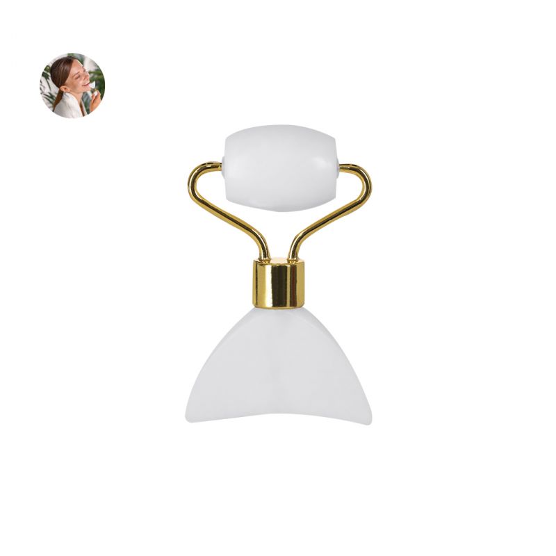 Rodillo facial de alta calidad fabricado en piedra jade blanco. Agradable masajeador de mano para el rostro, con cilindro facial fabricados en suave piedra pulida y espátula.